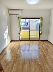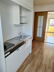 玄関・キッチンの様子。洋室・ロフト階段と物入れ。陽当たり良く明るいお部屋です。エアコン付。